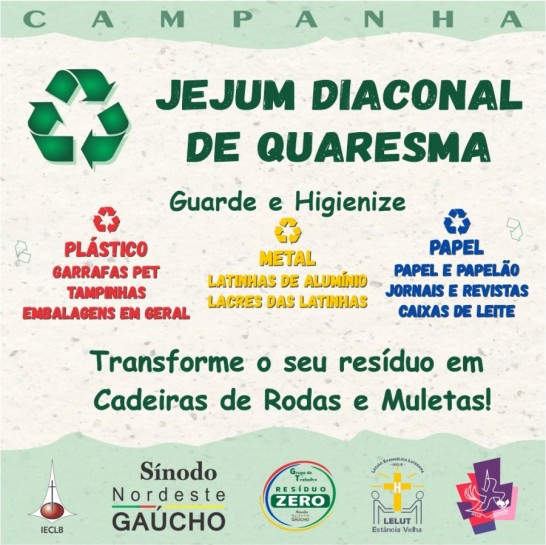 Você já pensou no que jejuar nesta quaresma? Ainda não? Então, venha conosco nesta campanha diaconal. A proposta do sínodo é que você consiga diminuir a produção de emissão de lixo e encaminhe corretamente os recicláveis. Assim, você contribui duplamente. O meio ambiente é um beneficiado.